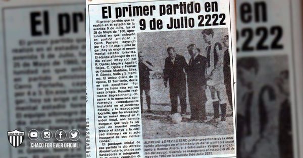 1960 / Se disputa el primer partido oficial en la cancha de For Ever en la avenida 9 de Julio 2222. La piedra fundamental fue colocada en la década del ’50. Se jugó un partido amistoso frente a Cerro Porteño de Paraguay, que ganó 4-3. El negro formo con Ricardo Ojeda, Alegre, Aguilar, Rojas, Cartero C. Ojeda, Fernando Gomez,Tingua Marcelino Maidana, G. Silva, Hector Gomez, Solis (Arnaldo Forastier) Sergio Ramirez. Dt: Tinguita Teodoro Maidana. El primer puntapié fue del primer presidente Lopez Lotero Preside la entidad el doctor Ramón Prieto. Se dejaba así el viejo estadio donde hoy está la Plaza España. dio con la presencia del presidente de ese momento R. Prieto.