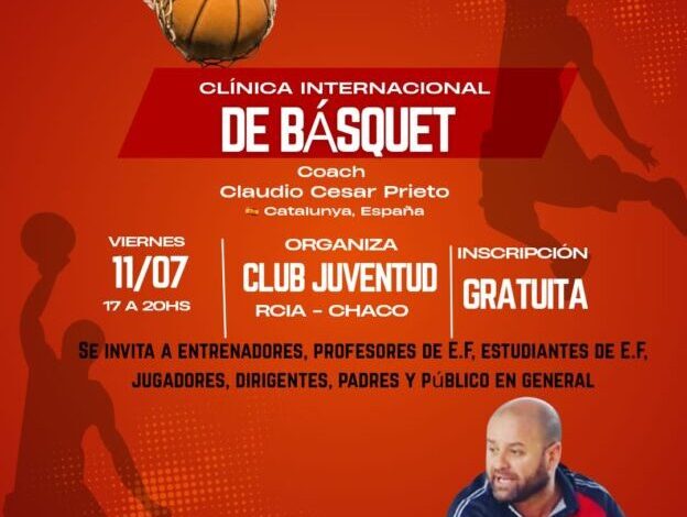 El club Juventud invita a participar este viernes 11 de la «Clínica Internacional Básquet» en la cual disertará el entrenador Claudio Cesar Prieto , actualmente trabajando en Tarragona Básquet (Cataluña – España).