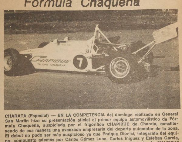 1979 / Queda conformado el primer equipo de Fórmula Chaqueña “Chapibué”, integrado por Enrique Dionisi, Carlos Gómez Luna, Carlos Iñiguez y Esteban García. La presentación no pudo ser más auspiciosa, ya que se impuso Dionisi en la competencia de General San Martín.