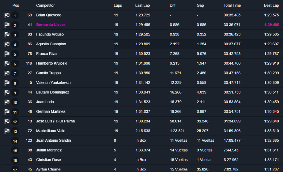 El Bacha y Thiago Falivene completaron el podio en el trazado platense. Galeano, Fulini, Chiriotti, Olaverría, Sexe, Memmo y Traverso completaron el «Top 10».