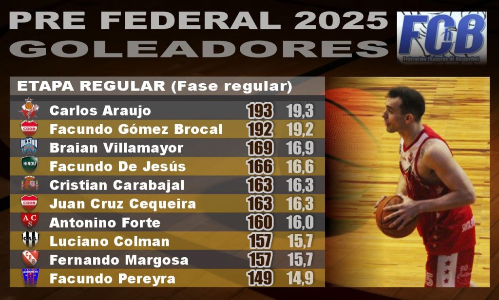 Al concluir la fase regular del campeonato provincial Pre-Federal de Básquet, Carlos Gastón Araujo, de Cultural de Santa Sylvina, cerró como el máximo anotador con 193 puntos; aunque ahí nomás terminó Facundo Gómez Brocal, de Don Bosco, con 192. En el podio concluyó Braian Villamayor, del Club Acción de Sáenz Peña, con 169.