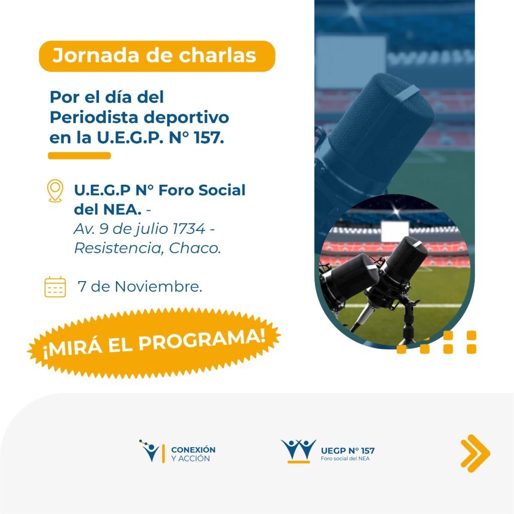 La jornada que se realizará este viernes 7 de noviembre, comenzando a las 17 horas en la sede central de la UEGP N° 157, ubicada en Avenida 9 de julio 1734 de la ciudad de Resistencia, con una presentación de los docentes específicos de la carrera de Periodismo Deportivo de la institución, donde brindarán una mirada sobre la actualidad en el medio local del periodismo deportivo y darán lugar a invitados especiales para la jornada.