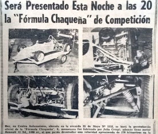 1977 / Nace una nueva Categoría en nuestro Zonal » FÓRMULA RENAULT CHAQUEÑA». Estuvieron a cargo la presentación en el concesionario Centro Automotores S.A. de Resistencia, los presidentes de la Federación Regional de automovilismo Zonal 7, Tomás Pancho Arce y de la Asociación de Volantes del Nordeste, Miguel Rabino. La AVN encaró decididamente la llegada de estos fórmulas facilitando a todos los interesados la adquisición de los mismos ya que por su intermedio realizarían todos los trámites necesarios. (Constructor Tulio Crespi)