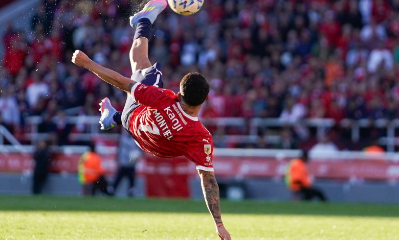 Foto portada: Santiago Montiel ensaya la chilena antes de marcar un golazo para Independiente ante Independiente Rivadavia.