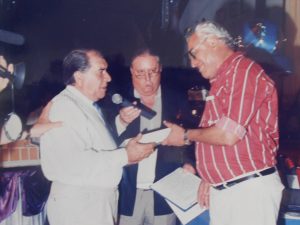 Ramón González entregando un reconocimiento al Fanfa Veloso. En el centro el conductor y relato Edmundo Duncan Molina.