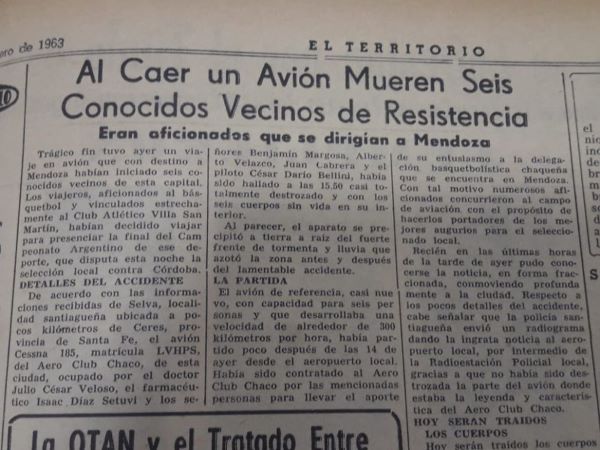 1963 / En un accidente aéreo en Ceres, Santa Fe, mueren varios aficionados y familiares que viajaban a Mendoza, para ver la final del campeonato argentino de básquetbol entre Chaco y Córdoba. En el avión del Aero Club Chaco, piloteado por Bellini, viajaban y fallecieron Julio César Veloso, Alberto Velazco, Isaac Díaz Setuvi, Benjamín Tango Margosa y Juan Cabrera.