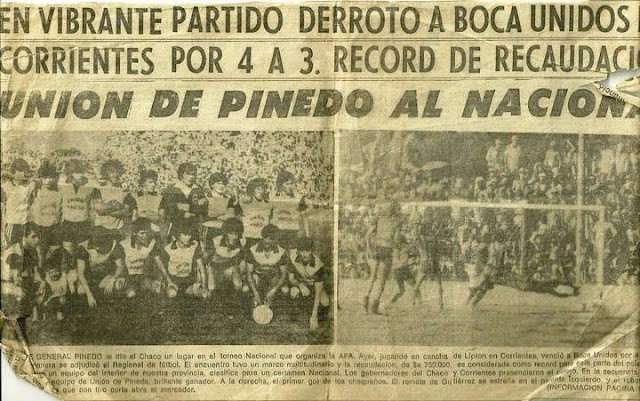 1984 / Unión de General Pinedo gana el Torneo Regional de fútbol y se clasifica para jugar el Torneo Nacional, al superar en los cotejos finales a Boca Unidos de Corrientes. En la ida en Charata igualaron 0 a 0; en Corrientes ganaron los chaqueños 4 a 3. Dos goles fueron de Eduardo Córdoba, Juan Carlos Cisterna y Juan Carlos Argüello. El equipo de la final formó con Dávalos: Omar Gómez, Osvaldo Gómez, Omar Pared y Cisterna; Hildo Coria Gutiérrez, Lucio Pereyra y Roberto Franco; Luis Schoning, Córdoba y Argüello. AS: Capitanich. También ingresaron Alfredo Ibáñez y Oscar Ramírez. DT Carlos Rojo.