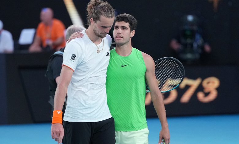 Foto portada el final del juego en que Alcaraz superó luego de 5 setes a Zverev. Agotados los dos.
