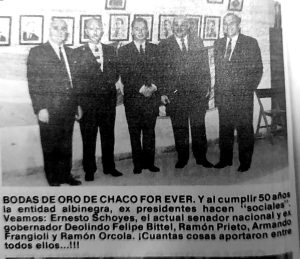 PRESIDENTES Ernesto Schoyes, Deolindo Felipe Bittel, Ramón Prieto, Armando Frangioli y Ramón Orcola en la foto de portada, en el cincuentenario