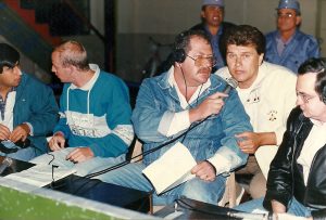 Luis Darío Molodezky en una transmisión de básquetbol en una nota con Rabincho Ojeda. A la derecha el locutor Pepe Silveira y a la izquierda el comentarista Mular